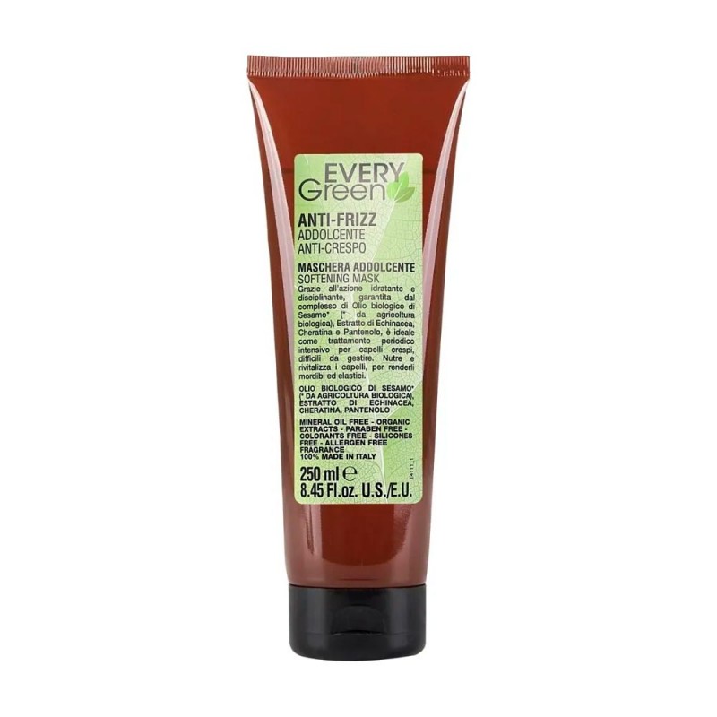 Маска Dikson Every Green Anti-Frizz Mashera Idratante обеспечивает глубокое увлажнение, питание и бережное восстановление структуры волос. Уникальная формула обогащена натуральными компонентами, такими как органическое кунжутное масло, экстракт эхинацеи, кератин и витамин B5 (пантенол). Средство предназначено специально для регулярного либо интенсивного восстановления сильно вьющихся и трудноуправляемых локонов. Оно насыщает каждый волос по всей длине, начиная от корней и заканчивая кончиками, делая пряди мягкими, послушными и гладкими. Дополнительно устраняет статическое электричество.